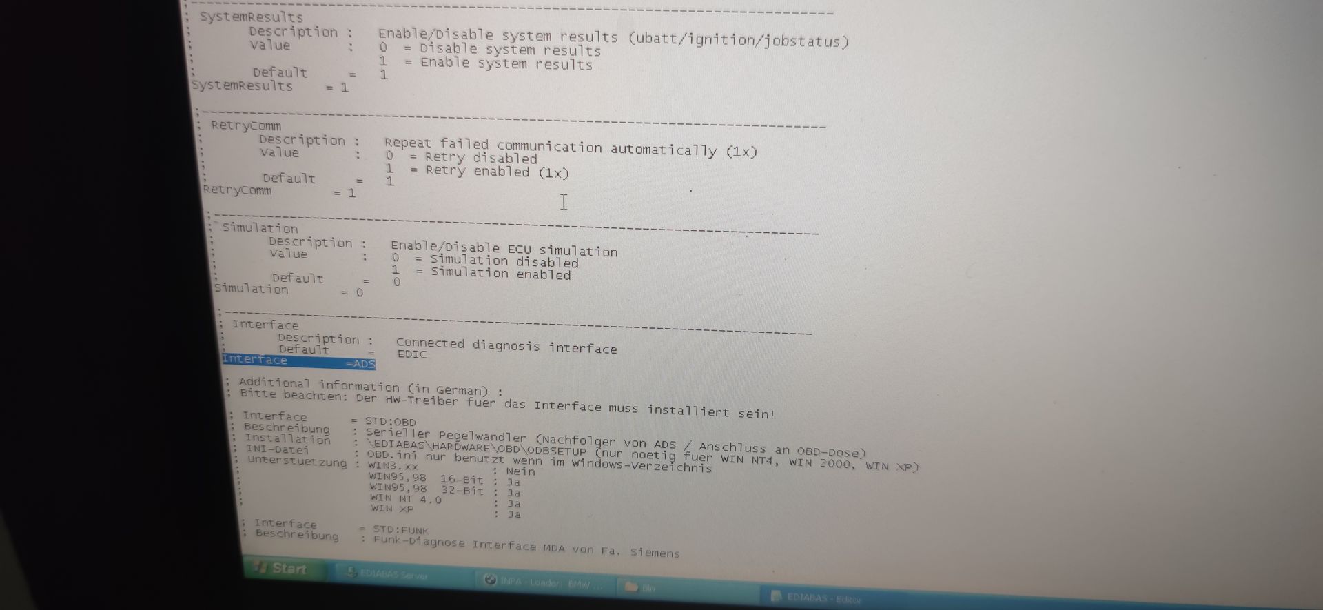 Inpaload usw bekomme ich auf, wenn ich jedoch die ediabas.ini und die obd.ini von OBD auf ADS umschreibe und den PC dann neustarte, um INPA wieder zu starten, bekomme ich eine Fehlermeldung.