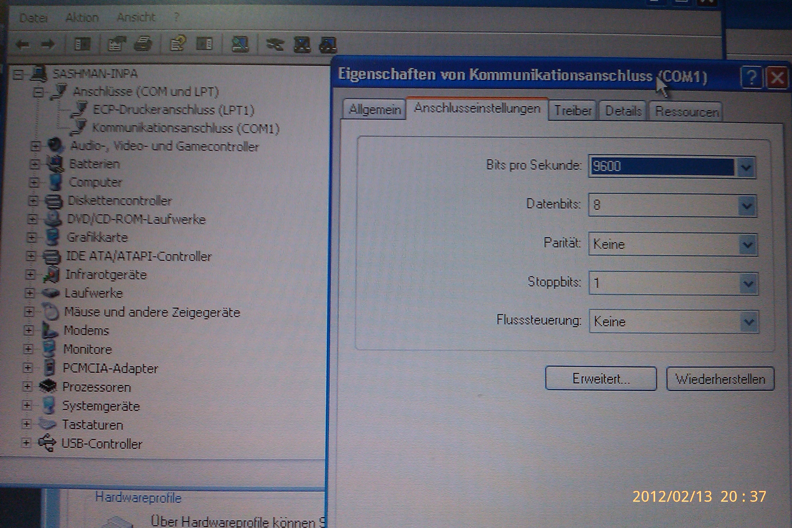 „Hardware“) wählen Sie unter den Ports COM1 aus und wählen unter der Reggisterkarte