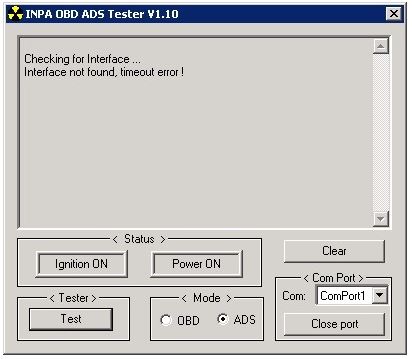 ich habe das ADS/OBD Interface an einem Sony Vaio und einem Dell D610 jeweils mit direktem COM-Port getestet. WIndows XP SP3, INPA 4.4.7 mit EDIABAS 6.4.3 an einem Z3 (E36) Bj. 01/1997. Windows bereits neu installiert - ohne Erfolg. Ediabas.ini und obd.ini sind geändert, ADS-Treiber installiert.